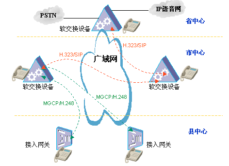 針對(duì)這種體系結(jié)構(gòu),軟交換技術(shù)就大有可為了,各地市布置軟交換設(shè)備,其間采用H.323/SIP點(diǎn)對(duì)點(diǎn)局間協(xié)議,負(fù)責(zé)各軟交換機(jī)之間的通信,在地市到縣區(qū)之間采用MGCP/H.248協(xié)議,這種協(xié)議體系充分吸取了軟交換體系控制與業(yè)務(wù)分離的思想,具有高度靈活性,可以兼容PSTN、運(yùn)營(yíng)商IP語音網(wǎng)、原有PBX系統(tǒng)等,并且從多方面保障話音質(zhì)量;管理上由地市軟交換設(shè)備對(duì)縣區(qū)的接入網(wǎng)關(guān)設(shè)備進(jìn)行統(tǒng)一管理,號(hào)碼進(jìn)行統(tǒng)一分配;同時(shí),由地市軟交換設(shè)備提供多達(dá)數(shù)十種增值業(yè)務(wù),可以實(shí)現(xiàn)業(yè)務(wù)的統(tǒng)一升級(jí),簡(jiǎn)單方便。