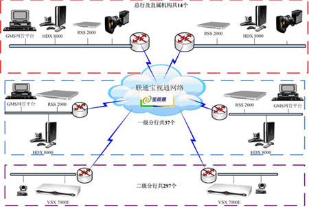接入層:以視頻設(shè)備為主,包括總公司、一級分公司、總公司直屬機(jī)構(gòu)共49臺寶利通 HDX 8006高清視頻終端,全國二級分公司共300個寶利通 VSX 7000標(biāo)清視頻終端。