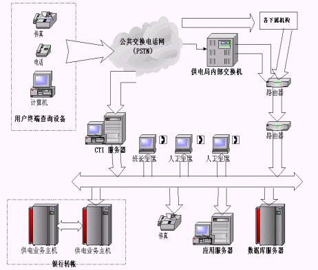 (3)自動轉(zhuǎn)人工服務(wù)。系統(tǒng)還可自動轉(zhuǎn)接人工坐席,由電力專業(yè)人員負責(zé)解答和處理客戶意見;蛘邔⒖蛻舴⻊(wù)中心系統(tǒng)與后臺數(shù)據(jù)庫服務(wù)器相接,通過客戶提供的相關(guān)信息,為客戶提供個性化的在線服務(wù)。