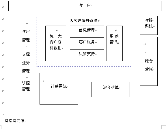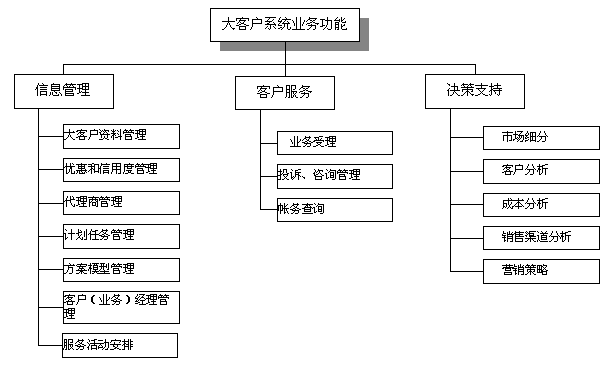 電信大客戶管理系統是在收集大客戶市場調查信息、大客戶資料信息、大客戶經營戰(zhàn)略資源的基礎上,自動采集專業(yè)計費、綜合營帳、客服、網管、財務等系統的相關數據,實現快速、全面、準確的新客戶業(yè)務受理、新增需求受理及故障處理過程通道,實現完善的客戶經理管理、代理商管理系統,最終實現完整的大客戶滿意度評估體系和針對大客戶的個性化服務。建成后的系統從管理、服務、分析三方面出發(fā)主要應具備信息管理、客戶服務、決策支持功能。