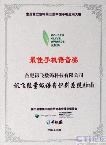 2008年6月26日,代表了中國手機應用最高水平、最新發(fā)展的索尼愛立信杯第三屆中國手機應用大賽金枝獎頒獎典禮在北京隆重舉行,科大訊飛全資子公司——訊飛數(shù)碼提交的參賽產(chǎn)品,輕量級語音識別系統(tǒng)Aitalk,榮獲本屆大賽 “最佳手機語音金枝獎”。這是科大訊飛既在本賽事首屆、第二屆獲此殊榮后,連續(xù)第三年奪得該獎項,充分體現(xiàn)了科大訊飛在手機語音應用領域具備的超群實力和絕對的領先地位。CTI論壇編輯