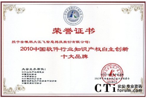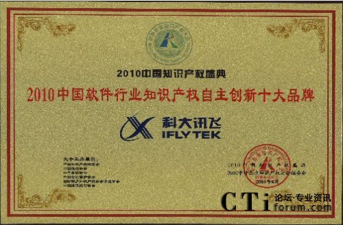 CTI論壇(ctiforum)4月29日消息(記者 潘婷婷):2010年4月25日,由中國知識產(chǎn)權(quán)研究會、中國專利保護協(xié)會、中國版權(quán)協(xié)會等單位聯(lián)合舉辦的“2010中外企業(yè)知識產(chǎn)權(quán)大會”在人民大會堂隆重舉行。在當日的“2010中國知識產(chǎn)權(quán)盛典頒獎典禮”中,科大訊飛憑借強大的自主創(chuàng)新能力以及在知識產(chǎn)權(quán)創(chuàng)造、保護與應(yīng)用方面的突出表現(xiàn)獲評“2010年中國軟件行業(yè)知識產(chǎn)權(quán)自主創(chuàng)新十大品牌”。CTI論壇報道