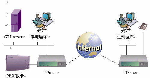 圖中,IPmux設備通過互聯網透明傳送電話線路上的摘機、掛機、振鈴、話音、信號音、DTMF、Caller-ID、FAX等數據和信號。通過采用冗余、糾錯技術,可以保證實時、可靠地傳送這些數據。