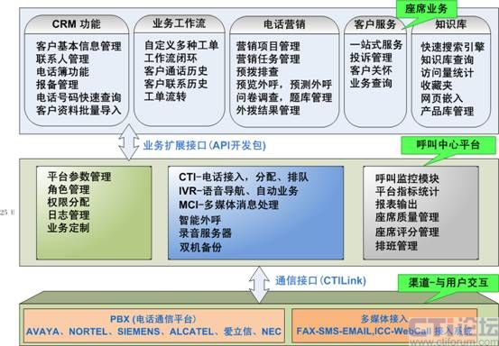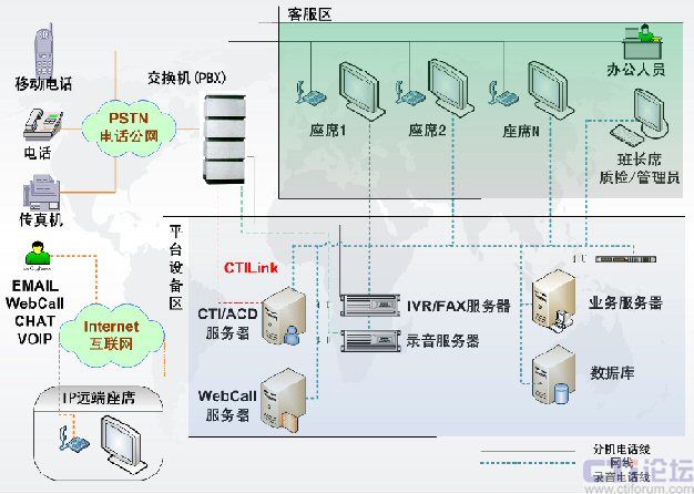 呼叫中心通信平臺,包含了交換機(jī)(PBX)、CTI服務(wù)器、IVR服務(wù)器、傳真服務(wù)器、全程錄音設(shè)備等幾個部分,是客服中心實(shí)施的基礎(chǔ)。