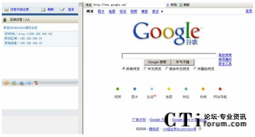 在客服人員與網(wǎng)站訪客聊天的過程中,可以通過“網(wǎng)頁(yè)同步”,使網(wǎng)站訪客的電腦上自動(dòng)彈出與客服人員同樣的網(wǎng)頁(yè)(如下圖:網(wǎng)站訪客的電腦上自動(dòng)彈出www.google.com的網(wǎng)站)。