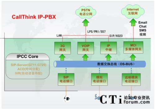 IPCC Core是IP-PBX的核心部分,提供了配置IP分機(jī)號(hào)碼(Extension Number)、功能按鈕以及通話管理和ACD路由策略功能;它可以支持多達(dá)1000個(gè)IP語(yǔ)音終端呼叫請(qǐng)求,通過分組交換,實(shí)現(xiàn)IP分機(jī)、普通分機(jī)、互聯(lián)網(wǎng)上IP電話之間的互聯(lián)互通;通過Voip網(wǎng)關(guān),可以實(shí)現(xiàn)IP網(wǎng)絡(luò)和傳統(tǒng)電路交換電話網(wǎng)的通信,完成異種網(wǎng)絡(luò)的電話呼入和呼出;