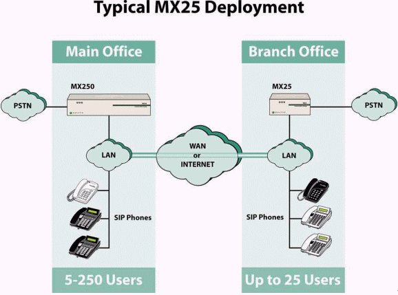 當(dāng)與MX250一起使用時(shí), MX25提供了一種既能將MX250的功能擴(kuò)展至分支機(jī)構(gòu),同時(shí)又可確保該分支機(jī)構(gòu)與PSTN有效連接的低成本的解決方案。遠(yuǎn)程機(jī)構(gòu)的工作人員同樣可以使用語音信箱、自動話務(wù)員、在線狀態(tài)和即時(shí)消息等功能。如同在總部工作一樣這些遠(yuǎn)程機(jī)構(gòu)的工作人員可以與企業(yè)內(nèi)部任意其它地點(diǎn)的人員進(jìn)行溝通,也可以擔(dān)當(dāng)接線員或ACD(自動話務(wù)分配)組成員的工作。