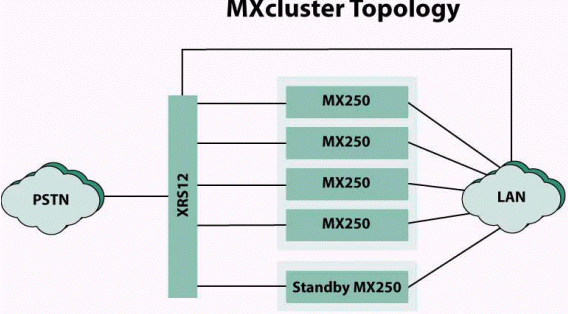 為支持冗余配置蘇迪思科技公司同時(shí)推出新產(chǎn)品XRS12物理連接轉(zhuǎn)換開關(guān)。XRS12可被安裝在19英吋的機(jī)架上,并將占用機(jī)架中的1RU單元。MXcluster集群中每一臺MX250上的PSTN線路均通過XRS12連接至PSTN網(wǎng)絡(luò)。當(dāng)某一臺MX250出現(xiàn)故障時(shí),XRS12自動將與該臺MX250對應(yīng)的PSTN網(wǎng)絡(luò)線路轉(zhuǎn)接至備份MX250上。使用XRS12,無需管理員介入操作,即可實(shí)現(xiàn)MXcluster集群與PSTN的不間斷連接。
