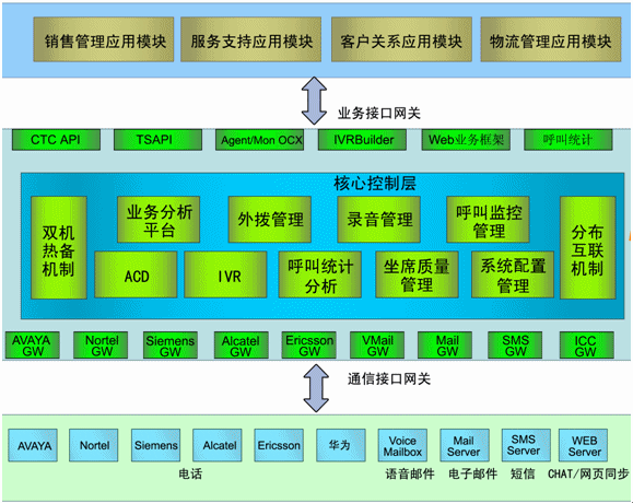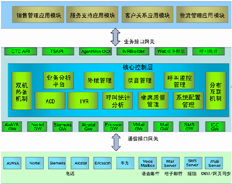 核心控制層:ACD、IVR、呼叫統(tǒng)計分析、坐席質(zhì)量管理、系統(tǒng)配置管理、業(yè)務(wù)分析平臺、預(yù)測外撥管理、工作流平臺、坐席資源管理、分布互連機制、雙機熱備機制;