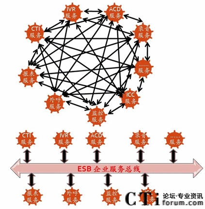 簡(jiǎn)單一點(diǎn),下面兩種構(gòu)架的方式,第一種,雜亂無章,第二種,非常清晰,第二種用的就是ESB的方式。