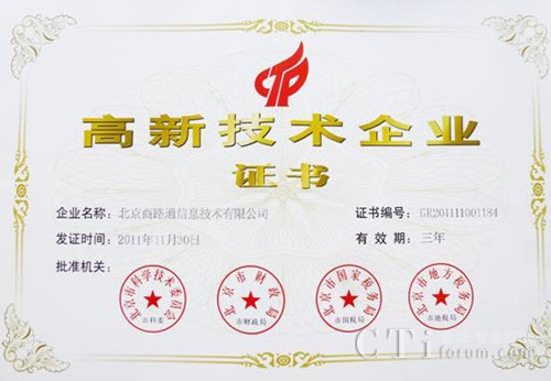 CTI論壇(ctiforum)3月23日消息(記者 浩宇):商路通再傳喜訊,2012年3月12日商路通獲得了“國家級高新技術(shù)企業(yè)”證書,(證書編號:GR201111001184,有效期三年),這標(biāo)志著商路通發(fā)展的又一個新的里程碑。CTI論壇報道
