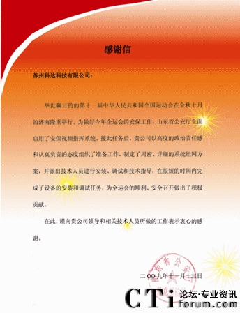 CTI論壇(ctiforum)12月29日消息(記者 張塵):日前 ,山東省公安廳向蘇州科達(dá)科技有限公司發(fā)來感謝信,對(duì)蘇州科達(dá)為保障全運(yùn)會(huì)順利、安全召開所做的貢獻(xiàn)表示衷心的感謝。CTI論壇報(bào)道