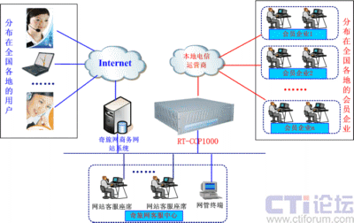 融天科技采用自主研發(fā)的融合通信平臺RT-CCP1000設備一套為奇旅網部署了一套Web-call聯(lián)絡中心。RT-CCP1000集傳統(tǒng)PBX、IP-PBX、CTI、IVR、DB、VOIP、錄音、傳真等服務于一體,以模塊化的形式提供用戶所需的各種功能,是一套功能強大的一體化融合通信平臺,安裝部署非常方便,維護管理非常簡單。該方案中,與本地電信運營商采用數字中繼E1接口和模擬中繼FXO接口方式連接,軟電話以控件方式嵌入到奇旅網公司的商務網站上, RT-CCP1000將接收所有以該控件方式來至Internet來的呼叫,并通過與電信運營商接口呼叫相關會員企業(yè)綁定的聯(lián)絡電話,這樣就實現了上網用戶通過電腦與會員企業(yè)免費進行直接聯(lián)絡。網絡拓撲圖如下: