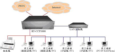 - 用單個(gè)RT-CCP1000取代原有系統(tǒng)的傳統(tǒng)PBX和代理服務(wù)器,提供電話系統(tǒng)功能和Internet接入。