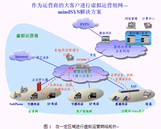 對于希望投資低啟動快的虛擬運營商,我們設(shè)計了mindSYS解決方案。在mindSYS解決方案中,以SS3000-V作為核心的呼叫控制、業(yè)務(wù)管理和計費平臺,配合中繼網(wǎng)關(guān)MG3000-T以及眾多的接入終端,組成一個完整的解決方案。該方案可以滿足虛擬運營商的初期業(yè)務(wù)發(fā)展,有強大的組網(wǎng)適應(yīng)性和良好的管理計費功能,并具備極好的可擴展性,可以根據(jù)用戶的業(yè)務(wù)發(fā)展,平滑升級到更強大的增值業(yè)務(wù)、運營管理計費平臺--OpenSP-K平臺,無縫過渡到完善的大規(guī)模虛擬運營解決方案。