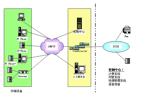 控制中心:包括資源管理系統(tǒng)、計費系統(tǒng)、網(wǎng)管系統(tǒng)、語音信箱。 其中,資源管理系統(tǒng)主要執(zhí)行地址翻譯、權(quán)限控制、路由管理等功能;計費系統(tǒng)主要完成計費及結(jié)算功能;網(wǎng)管系統(tǒng)完成對網(wǎng)絡及IP