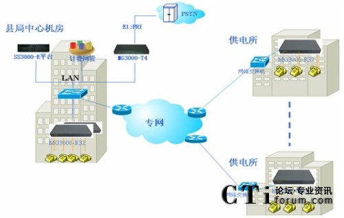 根據(jù)廣宗電力公司情況大唐高鴻提出在電力公司現(xiàn)有的網(wǎng)絡(luò)建立IP語音系統(tǒng),使各供電所、縣局間的語音服務(wù)運營在現(xiàn)有完善的IP網(wǎng)絡(luò)上,實現(xiàn)“語音、數(shù)據(jù)等業(yè)務(wù)融合”的先進網(wǎng)絡(luò),通過縣局對全縣各單位電話系統(tǒng)統(tǒng)一控制管理。