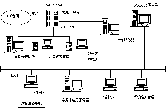 主要包括:Siemens Hicom 318com交換機(jī)、CTI服務(wù)器、IVR/FAX服務(wù)器、業(yè)務(wù)代表座席、班長(zhǎng)和質(zhì)檢座席、電話錄音監(jiān)聽(tīng)系統(tǒng)、數(shù)據(jù)庫(kù)應(yīng)用服務(wù)器、統(tǒng)計(jì)分析工作站、系統(tǒng)維護(hù)管理工作站、業(yè)務(wù)網(wǎng)關(guān)、網(wǎng)絡(luò)系統(tǒng),其邏輯結(jié)構(gòu)下圖所示。