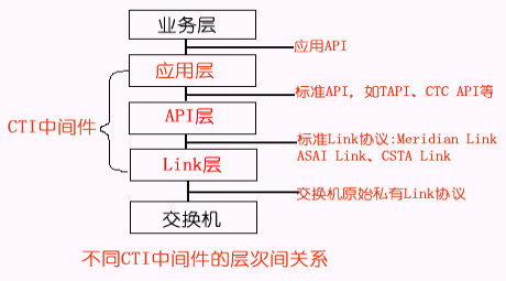 根據(jù)CTI的功能定位,我們可以把CTI產(chǎn)品劃分為不同的層次,一般地可分為三種類型:Link層產(chǎn)品、API層產(chǎn)品、應用層產(chǎn)品,其分層結構示意圖如下所示: