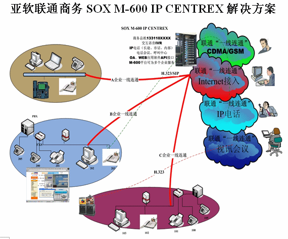 亞軟SOX融合通信解決方案也叫聯(lián)通商務解決方案,該方案是基于軟交換的可為多個集團用戶提供IP語音解決方案。SOX融合通信解決方案為集群用戶提供了區(qū)別于傳統(tǒng)集團內部、外部的通信方式,集團無需再購置PBX及為其支付維護費用。由于SOX融合通信解決方案是置于IDC托管中心并基于IP軟交換技術,所以沒有地域限制,具有集群性、可移動性等IP通信特征。