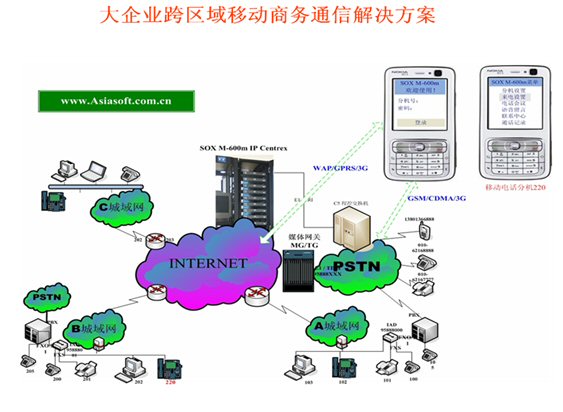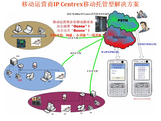 Mail,可發(fā)起WAP電話會議,可訪問企業(yè)的CRM、ERP等應(yīng)用軟件并集成點擊呼叫等等)。不僅移動運營商可以替代第一代的移動總機,固網(wǎng)運營商采用SOX-M移動軟交換也可以輕松的開展移動總機(小靈通或手機)的業(yè)務(wù)了,但SOX-M系統(tǒng)融合移動運營商的無線互聯(lián)網(wǎng)數(shù)據(jù)業(yè)務(wù)將產(chǎn)生更大的利于企業(yè)應(yīng)用的前景,移動總機(語音+WAP)的融合應(yīng)用成為第二代移動總機殺手級應(yīng)用,令移動總機如虎添翼。