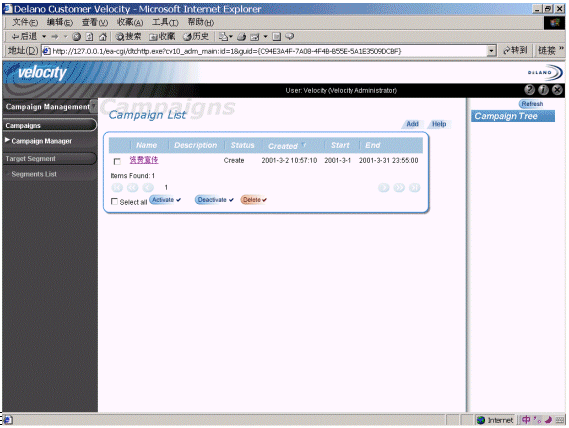 易虹德龍(Delano),所提供的Custoemr Velocity滿足了CRM用戶在電子營銷方面的需求。在這個平臺上,CRM系統(tǒng)用戶,可以通過WEB界面,輕松地針對客戶分組制定和管理所有市場活動。這些市場活動,通過多個步驟一步一步地抓住客戶的“心”。下圖是使用易虹解決方案進行活動管理的界面: