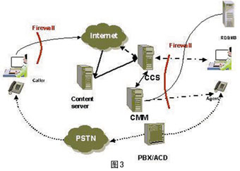 ----圖2說明了在集成互聯(lián)網電話網關時進行協(xié)同會話的流程,圖中實線為數(shù)據(jù)信息傳遞的鏈路,虛線為語音傳遞的鏈路。通過ITG和PBX/ACD 的特定交互接口,將呼叫中心外部的IP電話鏈路集成到CCIS系統(tǒng)中。值得注意的是,ITG 和CCS需要安裝在企業(yè)防火墻的外側,以方便呼叫者的訪問。