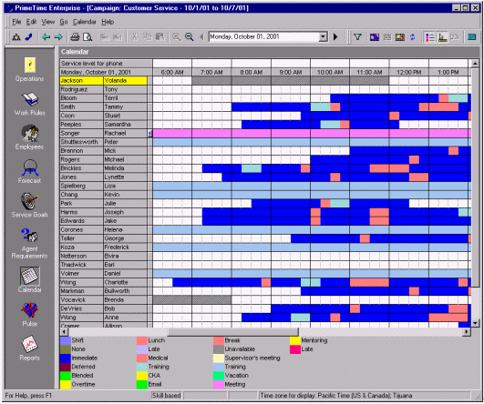 絕大多數(shù)的WFMS可以通過歷史數(shù)據(jù)和人員情況自動生成排班表。而且它也只是簡單的根據(jù)呼叫中心的運營時間來排班。舉個例子,某個呼叫中心在排班是有兩個班,一個工作時間是早7點到下午3點,另一個是早九點到晚五點,這就意味著不僅要安排早、晚休息,還要顧及到午休的時間。休息的安排要保證能夠在電話的持續(xù)中也能有持續(xù)的人員保證電話量。在這個自動化軟件的之中還有一個因素要能夠?qū)崿F(xiàn)自動化--人的因素。例如:Mary和Jane想同時去吃午餐,然而自動化的排班表并不是這樣的。然而主管根據(jù)當時的話務(wù)量情況和工作狀況以及工作規(guī)范批準了Mary和Jane共享午餐的要求,而WFMS就要能夠處理這樣很有可能發(fā)生,而且是合理的情況。排班表的更改應(yīng)該就是簡單的拖拽圖標就應(yīng)該能夠?qū)崿F(xiàn)的功能,并且能夠在這種更改會對預(yù)測的話務(wù)量差生不好影響時,拒絕這種拖拽行為。