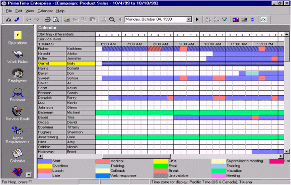 人員預(yù)測是一個每天、每周、每月、每年都需要作的工作計劃,為了能夠平衡呼叫中心人員的工作量和人員的可用性。通過將歷史數(shù)據(jù)和人員數(shù)據(jù)整合、加以分析,并借以WFMS體現(xiàn)出分配多少員工就可以達到既定的服務(wù)水準。一旦需要員工數(shù)量被估算出來,那么工作安排也就是每天、每周、每月、每天的排班表的輪廓也就出來了。絕大多數(shù)的WFMS軟件的界面和操作都很相似,最主要的就是內(nèi)容就是要包含員工的姓名、員工的工作時間、員工的其他日程(最小單位是15分鐘),并且能夠提供具有多個管理軟件接口,和多種不同的管理方式。圖9.就是一個典型的人員排班表,以15分鐘為單位體現(xiàn)人員的工作安排。附加選項還可以包含"休假""遲到""曠工"等等,并且這排班表還可以通過歷史數(shù)據(jù)體現(xiàn)出哪個時段可能出現(xiàn)人員不足哪個時段容易出現(xiàn)人員過,F(xiàn)象。