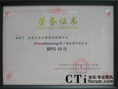 CTI論壇(ctiforum)06月16日消息: 日前,從國家工業(yè)和信息化部傳來喜訊:北京九五太維資訊有限公司2009年蟬聯(lián)“中國BPO企業(yè)10強(qiáng)”。CTI論壇報道