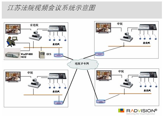 RADVISION為江蘇法院建立的視頻會議系統(tǒng)解決方案配備1臺RADVISION ViaIP400 MCU,建設容量為13點的2M會議,系統(tǒng)支持不同需求的會議模式,包括研討型會議、遠程法庭、遠程審判、大型講演型會議和培訓等,會議資源由江蘇法院集中控制和調度。在安全性、技術先進性、可擴展性、易操作性和經濟性等方面,RADVISION視頻會議系統(tǒng)都做了充分的考量。