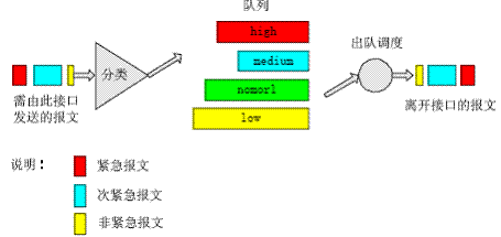 在報文到達(dá)路由設(shè)備接口后首先對報文進行分類,然后按照報文所屬的類別讓報文進入所屬隊列的尾部,在報文發(fā)送時按照優(yōu)先級總是在所有優(yōu)先級較高的隊列中的報文發(fā)送完畢后再發(fā)送低優(yōu)先級隊列中的報文,這樣在每次發(fā)送報文時總是將優(yōu)先級高的報文先發(fā)出去,保證了屬于較高優(yōu)先級隊列的報文有較低的時延與丟失率。