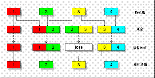 在傳輸帶寬允許的情況下,在發(fā)送端對重要的宏塊進行冗余編碼,發(fā)送給對端,這樣的話當(dāng)網(wǎng)絡(luò)出現(xiàn)異常出現(xiàn)丟包時,可以最大限度保護重要的編碼宏塊不丟失。如下: