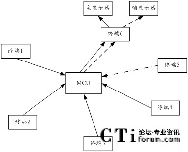 MCU將發(fā)言人所在的終端1的圖像通過(guò)主流通道發(fā)給終端6,將終端2、3、4的圖像解碼,并接成具有3個(gè)小畫面的單一畫面,編碼后通過(guò)輔流通道發(fā)給終端6,終端6將在主顯示器上看到終端1的圖像,在輔顯示器上看到終端2、3、4的圖像。