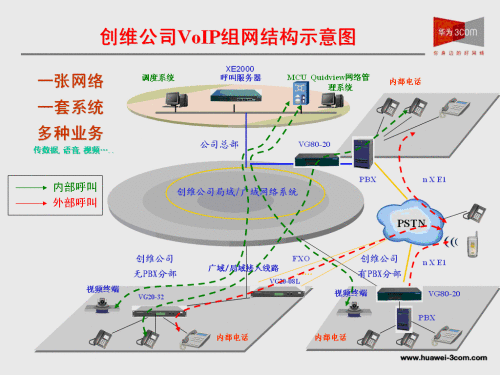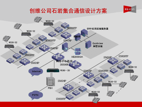 整個(gè)解決方案大量使用了華為3Com公司自主研發(fā)的XE2000、VG80-20、VG20-32、VG20-16、VG21-08等一系列VOIP系統(tǒng),整個(gè)石巖基地語(yǔ)音點(diǎn)數(shù)覆蓋1500點(diǎn)以上,未來(lái)發(fā)展可以擴(kuò)展到2500點(diǎn)。