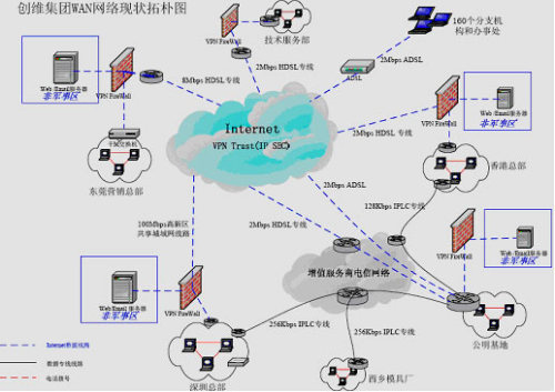 ·整個(gè)網(wǎng)絡(luò)連通性很差:隨著公司業(yè)務(wù)發(fā)展和規(guī)模擴(kuò)大,現(xiàn)在整個(gè)集團(tuán)除總部外還包括13個(gè)產(chǎn)業(yè)公司和全國(guó)160個(gè)分支機(jī)構(gòu),分布在以深圳為中心的全國(guó)各個(gè)地方,目前各產(chǎn)業(yè)公司之間的網(wǎng)絡(luò)連接除深圳總部、香港、公明基地和西鄉(xiāng)模具廠四地之間是通過(guò)窄帶IPLC專線連接外,其他各地均通過(guò)Internet公網(wǎng)連接,沒(méi)有構(gòu)成統(tǒng)一的企業(yè)內(nèi)部網(wǎng)絡(luò)互連。