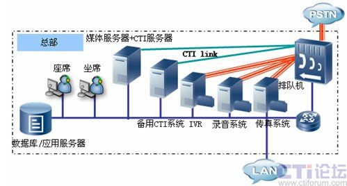 北京為總部中心,將部署CTI服務(wù)器、IVR服務(wù)器、錄音系統(tǒng)、傳真系統(tǒng)、文件服務(wù)器及相關(guān)業(yè)務(wù)數(shù)據(jù)庫服務(wù)器,為各個(gè)營業(yè)網(wǎng)點(diǎn)提供業(yè)務(wù)支撐?偛繉φ麄(gè)網(wǎng)絡(luò)進(jìn)行管理,包括平臺(tái)配置、業(yè)務(wù)管理、數(shù)據(jù)管理、人員調(diào)度等。在總部CTI系統(tǒng)我們采用主備模式,確保了在出現(xiàn)網(wǎng)絡(luò)故障主CTI系統(tǒng)無法提供服務(wù)情況下,備用CTI系統(tǒng)將接替主CTI系統(tǒng)工作,確保了整個(gè)系統(tǒng)的正常工作。硬件平臺(tái)方面,UAP我們采用了雙主控板雙電源供電工作模式,這對系統(tǒng)長期穩(wěn)定工作提供了保障?偛客瑫r(shí)也部署北京農(nóng)村商業(yè)銀行300個(gè)坐席人員,這些坐席人員可以按照業(yè)務(wù)進(jìn)行區(qū)分,大部分坐席精通一般的業(yè)務(wù),為普通客戶提供優(yōu)質(zhì)服務(wù),少部分坐席(專業(yè)坐席)人員為高價(jià)值客戶提供高級的專業(yè)的優(yōu)質(zhì)服務(wù),在普通坐席比較忙時(shí),專業(yè)坐席可以為普通用戶提供服務(wù),坐席中,還有極少部分可以充當(dāng)坐席管理員角色,他們也可以監(jiān)控各個(gè)分中心坐席服務(wù)的質(zhì)量,對有問題服務(wù)可以實(shí)現(xiàn)監(jiān)聽、監(jiān)察、和強(qiáng)拆功能,及時(shí)的保證服務(wù)質(zhì)量,維護(hù)了企業(yè)形象。