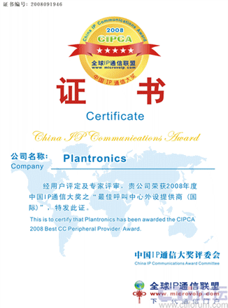 在近日結(jié)束的CIPCA2008年度中國IP通訊大獎評選中,繽特力(Plantronics) 榮獲“最佳呼叫中心外設(shè)提供商(國際類)”稱號。