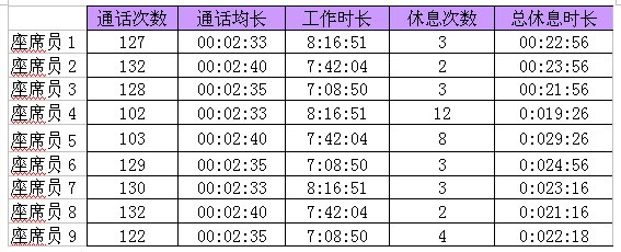 筆者寫這種文章,肯定要被天下的座席員給罵死,就像是魔術(shù)師最生氣的,莫過于電視臺(tái)在電視節(jié)目里面公開他們的秘密一樣,寫文章講座席員有哪些鉆漏洞的作法,真是犯天下之眾怒,吃力不討好。 上面這張表格,畫出的就是9個(gè)座席員的話務(wù)數(shù)據(jù)情況,分別列出了通話次數(shù)、通話均長(zhǎng)、工作時(shí)長(zhǎng)、休息次數(shù)、總休息時(shí)長(zhǎng)這五個(gè)KPI指標(biāo),你可以看的出來是哪一個(gè)座席員在呼攸嗎?