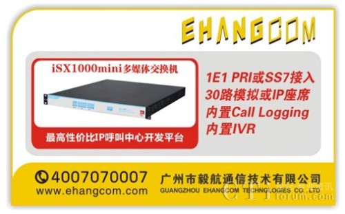 毅航通信為回饋社會(huì)各界朋友的關(guān)心與支持,加快中國(guó)中小企業(yè)呼叫中心產(chǎn)業(yè)化建設(shè),特推出作為最高性?xún)r(jià)比IP呼叫中心開(kāi)發(fā)平臺(tái)的毅航iSX1000mini多媒體交換機(jī),1E1 PRI或SS7接入,30路模擬或IP座席,內(nèi)置IVR及Call Logging,價(jià)格優(yōu)惠。
