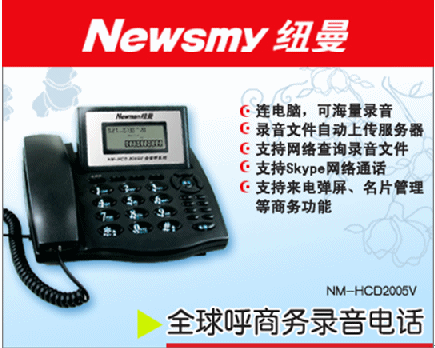 近日,北京紐曼公司(www.newman-cti.com)推出的一款具備強(qiáng)大商務(wù)管理功能的NM-HCD2005V全球呼商務(wù)錄音電話,以其強(qiáng)大的錄音和獨(dú)特的客戶信息管理功能獲得了消費(fèi)者的青睞。據(jù)了解,這款商務(wù)錄音電話除了具備傳統(tǒng)錄音電話的錄音和留言的功能之外,還支持網(wǎng)絡(luò)查詢、來電彈屏顯示、名片管理、撥打網(wǎng)絡(luò)電話、集中錄音管理,可將錄音上傳到企業(yè)服務(wù)器等強(qiáng)大實(shí)用的商務(wù)功能。