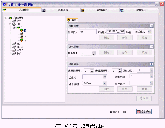 在局域網(wǎng)內(nèi)的任何一臺客戶機上,系統(tǒng)管理員通過客戶端控制程序訪問主機系統(tǒng)設置數(shù)據(jù)庫,具有系統(tǒng)管理員權(quán)限的客戶帳戶均可登錄進入AllContral系統(tǒng)控制臺程序。通過這個基于客戶端的程序,系統(tǒng)管理員可完成PABX設置、ACD設置、IVR設置等許多系統(tǒng)管理和配置工作。