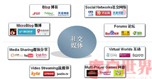 在國(guó)外這些網(wǎng)絡(luò)新媒體包括: SNS社交網(wǎng)絡(luò)(如FACEBOOK)、BLOGS博客、WIKI維基(WIKIEPEDIA\WIKITRAVEL、內(nèi)容分享(如圖片分享FLICKR\視頻分享YOUTUBE\社會(huì)標(biāo)簽DEL)、社區(qū)(包括傳統(tǒng)的BBS社區(qū)和新興的3D社區(qū)如第二人生等)和微博(如TWITTER)等。在國(guó)內(nèi)也涌現(xiàn)了一批社交媒體,如新浪、騰訊微博,天涯社區(qū)、開心網(wǎng)等。