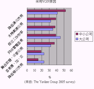 根據(jù)美國著名的咨詢公司 The Yankee Group 2005 年的調(diào)研各企業(yè)使用VOIP的原因,大企業(yè)與中小企業(yè)略有差異:大企業(yè)認為網(wǎng)絡(luò)管理、省錢、促進工作效率為最關(guān)鍵的三個原因;中小企業(yè)則認為省錢、網(wǎng)絡(luò)管理容易、支持高速應(yīng)用、促進工作效率為主要原因。