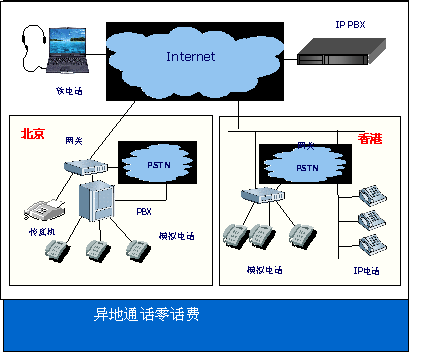 如圖所示,在整個系統(tǒng)中加入“訊時捷™ IPX”系統(tǒng)平臺設備后,各點之間話費為零。