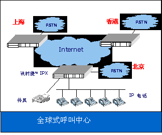 美國訊時捷™科技公司的“訊時捷™™ IPX”系統(tǒng)平臺,可以作為分布式的IP呼叫中心,并可利用各地的網(wǎng)關,提供低費用的IP