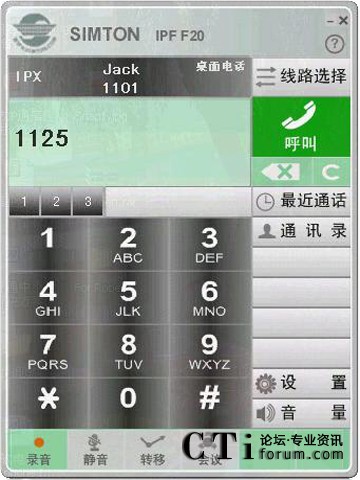 企業(yè)版需要另行購買,突出的功能包括“電子通信錄”、“軟電話與臺(tái)式電話機(jī)綁定”等。“電子通訊錄”功能已預(yù)裝在軟電話中,就像手機(jī)的通訊薄一樣。企業(yè)的員工不需要自己逐條輸入通訊錄,錄入與更新由企業(yè)的系統(tǒng)管理員在企業(yè)的通訊服務(wù)器上進(jìn)行,一人操作,全公司通訊錄同步更新。一個(gè)集團(tuán)公司或政府機(jī)構(gòu)有成百上千個(gè)員工很正常,但要讓大家記住這幾百個(gè)電話號(hào)碼就很困難了,目前較為常見的解決辦法有以下幾種,小一點(diǎn)的企業(yè)或機(jī)構(gòu)通常會(huì)打印一張通訊錄發(fā)放給每個(gè)員工,員工撥號(hào)前會(huì)先查一下這張通訊錄然后再將電話號(hào)碼在臺(tái)式辦公電話機(jī)上逐個(gè)輸入;規(guī)模大一點(diǎn)的企業(yè)會(huì)專門印制一本通訊薄發(fā)給每個(gè)員工,但由于機(jī)構(gòu)龐大,往往等到通訊簿發(fā)到手上,其中有很多電話號(hào)碼已經(jīng)不正確了。F20型軟電話的“與臺(tái)式電話機(jī)綁定”功能就很好的解決了這個(gè)問題,通過將電腦上的軟電話與辦公桌上的臺(tái)式電話機(jī)進(jìn)行綁定,企業(yè)中的所有員工在打電話時(shí),都可以先點(diǎn)擊電腦軟電話中的通訊錄,快速找到需要的電話號(hào)碼,然后只需點(diǎn)擊這個(gè)號(hào)碼條,這個(gè)員工的臺(tái)式電話機(jī)就會(huì)自動(dòng)向目標(biāo)電話進(jìn)行撥號(hào),待對方摘機(jī)后,這個(gè)員工的臺(tái)式電話機(jī)就會(huì)響起鈴聲,此時(shí)摘機(jī)就可進(jìn)行通話了。確實(shí)夠方便,夠?qū)嵱茫?