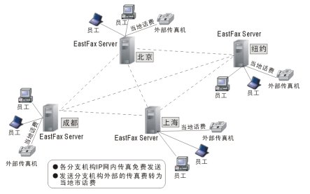 EastFax在國內(nèi)首次應(yīng)用中央服務(wù)器的方式管理整個集團(tuán)的傳真。改變以往各個服務(wù)器之間一一相連、繁瑣相加的方式,每個服務(wù)器只需與中央服務(wù)器相連,即加入整個集團(tuán)傳真網(wǎng)絡(luò)。