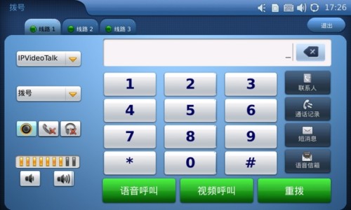 7寸大屏搭配寬大的數(shù)字虛擬鍵盤,讓你的撥號(hào)準(zhǔn)確無誤。同時(shí)界面的所顯示的通話功能諸如查找聯(lián)系人、查找通話記錄、發(fā)送短消息或者快速進(jìn)入語音信箱等功能也清晰明了?梢园l(fā)現(xiàn)的是,用戶在輸完號(hào)碼之后可自主選擇采用語音呼叫還是視頻呼叫。另外,同潮流網(wǎng)絡(luò)之前的一款視頻電話GXV3140一樣的是,GXV3175也在出廠自帶了一個(gè)IPVideoTalk賬號(hào)。該賬號(hào)是出廠時(shí)就已配置好的,每一臺(tái)電話配備一個(gè)號(hào)碼并顯示在桌面上。也就是說,用戶在拿到GXV3175并聯(lián)網(wǎng)之后即可使用該賬號(hào)撥打免費(fèi)的視頻電話了。這可是很多廠商所沒有的特殊功能。下面我們就使用隨機(jī)附送的IPVideoTalk賬號(hào)來?yè)艽蛞曨l電話。