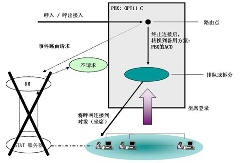如果CTI服務(wù)出現(xiàn)不可恢復(fù)的故障,CTI控制會將控制權(quán)交還給PBX,此時,PBX的ACD將自動生效,進行呼叫的分配可確保電話能夠有坐席接聽。